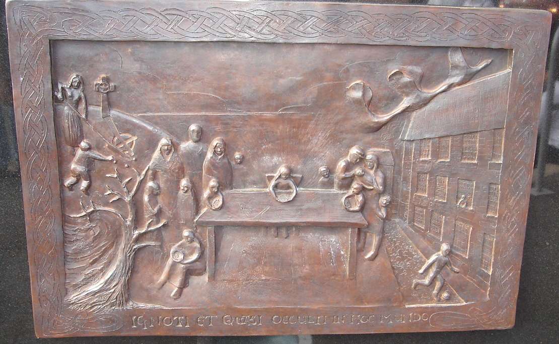 The sculpture of Walfrid himself is the well-known centrepiece of Kate Robinson’s work but the four plaques and the reverse are also of interest.