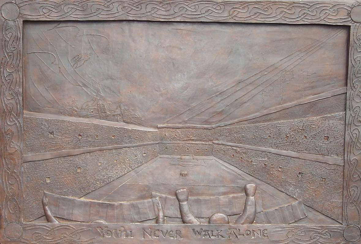The fourth and final plaque has illustrates today’s Celtic support in a packed Celtic Park (with four modern stands!) proudly singing You’ll Never Walk Alone and the Celtic players on the pitch in a Huddle before engaging in battle.