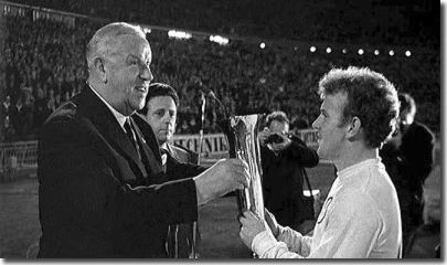 Image Leeds United captain Billy Bremner receives the 1968 Fair Cities Cup from Stanley Rous