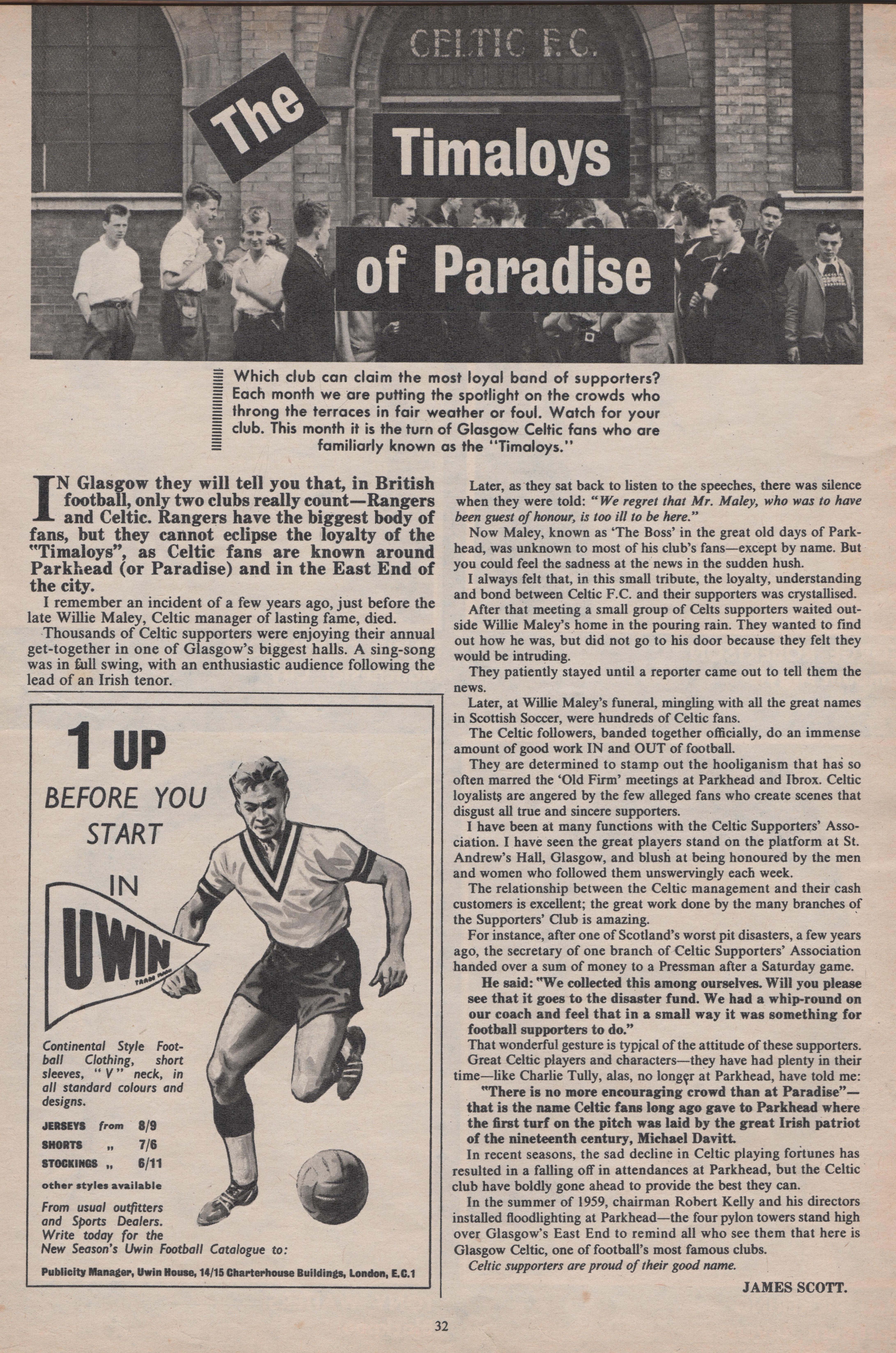 In the 1950s and 1960s, Charles Buchan’s Football Monthly was one of the biggest selling football magazines in the UK. The magazine’s coverage of the game in Scotland was sparse but Celtic fans did feature in a series about club supporters in March 1961.