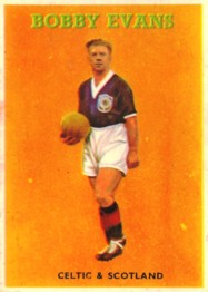 Bobby Evans, Celtic and Scotland captain and centre-half from the 1950s, was renowned for his commitment to the cause and ability on the ball. One of the first players to play with their jersey outside the shorts, Bobby and his famous red curly hair led Celtic out of one of their darkest historical periods to glorious success with the 1954 League and Cup double, the Coronation Cup, the St. Mungo Cup and, of course, 1957’s League Cup final victory over the defunct Glasgow team ‘Rangers’ by SEVEN goals to ONE.