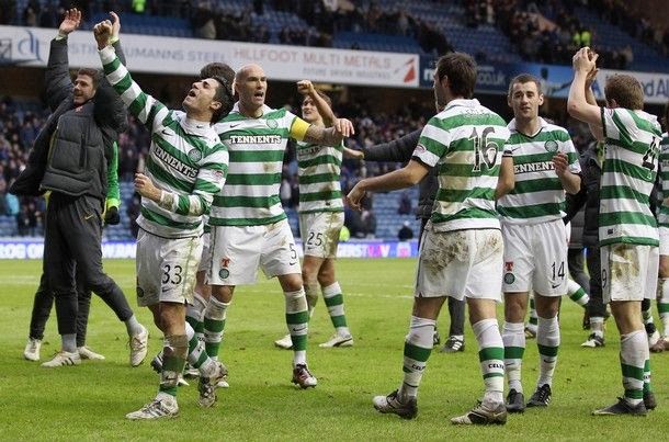 GLASGOW, SCOTLAND – JANUARY 02: Celtic players celebrate victory at the end of the Clydesdale Bank Premier League match between Rangers and Celtic at Ibrox Stadium on January 2, 2011 in Glasgow, Scotland.. (Photo by Jeff J Mitchell/Getty Images)