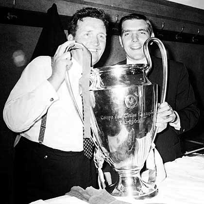 Jock Stein, the manager of Scottish football club Celtic, and player Bobby Murdoch, right, are seen with the European Cup in the dressing room of Estadio Nacional stadium, Lisbon, Portugal, May 25, 1967. Celtic defeated Inter Milan 2-1 in the Final to win the European Cup. (AP Photo)