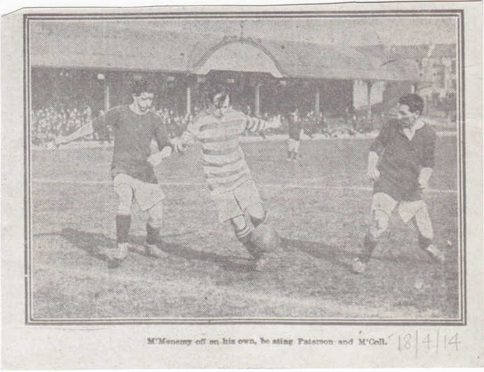 It’s not often you come across action photos of a game from a century ago but this picture above catches the legendary Celt Jimmy McMenemy in full flow against Hibernian at Celtic Park.