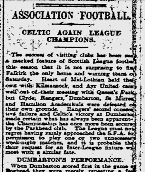 Rangers’ defeat at home to Third Lanark that day meant that they could not catch Celtic and they were eventually beaten in to second place in the League by Morton, who finished ten points behind Willie Maley’s team. A month later The Bulletin stated that Celtic were “the most consistently successful and best-managed professional club the game has ever seen.” However the winning sequence stopped with the fourth title. It was in many ways Willie Maley’s crowning achievement as Celtic manager – ten championships won in just thirteen seasons. Many thought at the time – and for the next five decades – that a winning series of six Scottish League titles could never be equalled, never mind beaten . . .