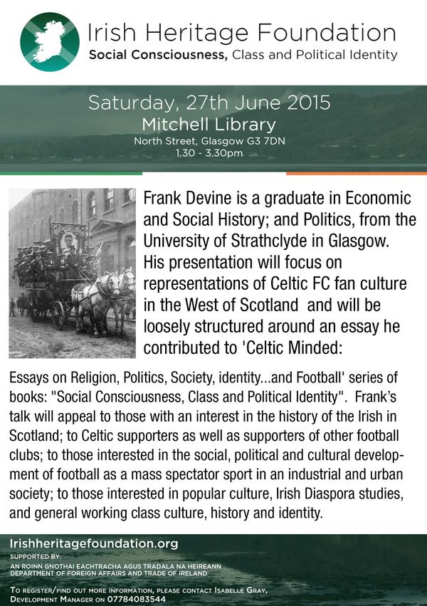 Frank Devine is a graduate in Economic and Social History with Politics from the University of Strathclyde and a contributor to the ground-breaking ‘Celtic Minded’ books edited by Dr. Joe Bradley. Frank’s presentation will feature on the identity and representations of Celtic FC fan culture in the West of Scotland from the club’s foundation in the 1880s to the present day.