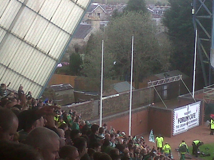 But no. As the jubilant Celtic players were taking the acclaim of the Moffat Stand opposite us, our hero re-appeared – well his top-half at least – the top half of his body is on top of the metal gate he’d just been ejected through! He was gesticulating in response to the cheering of his fellow fans when he suddenly disappeared out of sight – because a steward has pulled him off (stop sniggering at the back there!) His green and white scarf was still hanging down from the top of the gate.
