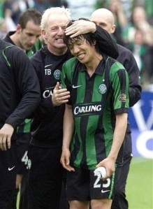 Shunsuke Nakamura, in the last minute of the game, had just struck a free-kick that gave Celtic a 2-1 victory and won the Championship for the second year in a row. The Chadwick Stand erupted as Naka took his green-and-black striped jersey off while running full pelt towards the front row, twirling it as he went before disappearing under a swarm of fans and fellow players. It turned out the Japanese genius wouldn’t be the only one flashing some flesh as the title party got under way.