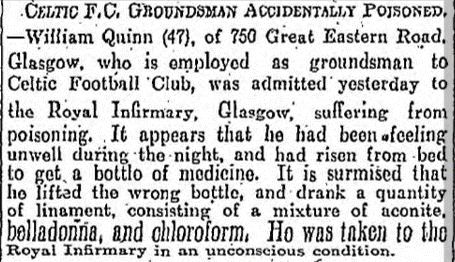 47 year-old Will was at his home in the Gallowgate (then Great Eastern Road) on the night of 18th November 1923. He awoke feeling unwell and rose from his bed to get some medicine from a cupboard to help him settle. Still half-asleep Will reached for one of a number of bottles in the cupboard believing it contained medicine. Instead, he picked up a bottle of linament (also known as embrocation) and drank it down – without realising he was consuming a potent cocktail of various chemicals including chloroform.