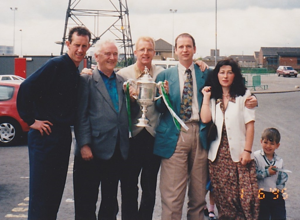 Frank meets Tommy Burns and Billy Stark with the Scottish Cup in 1995 along with son Peter, daughter-in-law Annette and grandson Alexander