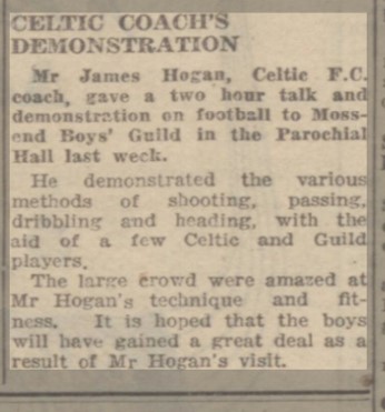 There was little doubt that Jimmy Hogan left a favourable impression on the younger Celtic players of the time however. As well as dedicated training sessions, he encouraged them to accompany him on his visits to Celtic supporter clubs and youth clubs where, in the role of the evangelical, Hogan expounded his theories on football – and gave dynamic demonstrations of the art. Many were left in awe at this elderly gentlemen whose ball skills, even in his late 60s, were jaw-dropping. In Johnny Paton’s view “He probably was a better passer of the ball than Charlie Tully – and Charlie was our most gifted player by far.”
