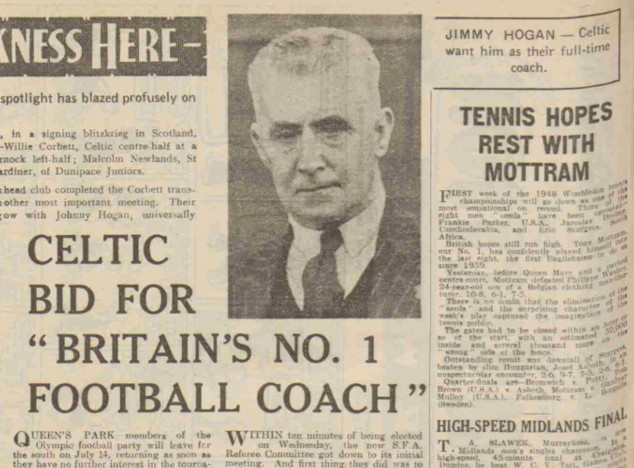 Celtic could not be faulted in the choice that they made. The Hogan pedigree was second-to-none. He had long advocated elements of ‘the Celtic way’ of playing football, accentuating skill and passing over brawn and relentless high balls. The Daily Record of 5th August 1948 reported: ‘Make no mistake about it, Jimmy is Scots by football adoption and has come here on a year’s contract to help Celtic re-discover their traditional style of play.’ It certainly felt like something of a homecoming for Hogan: “I feel at last that I have come hame. I’ve mixed with Scots footballers ever since I kicked leather and such has been my admiration for their play that I have come to think of myself as a Scot.”