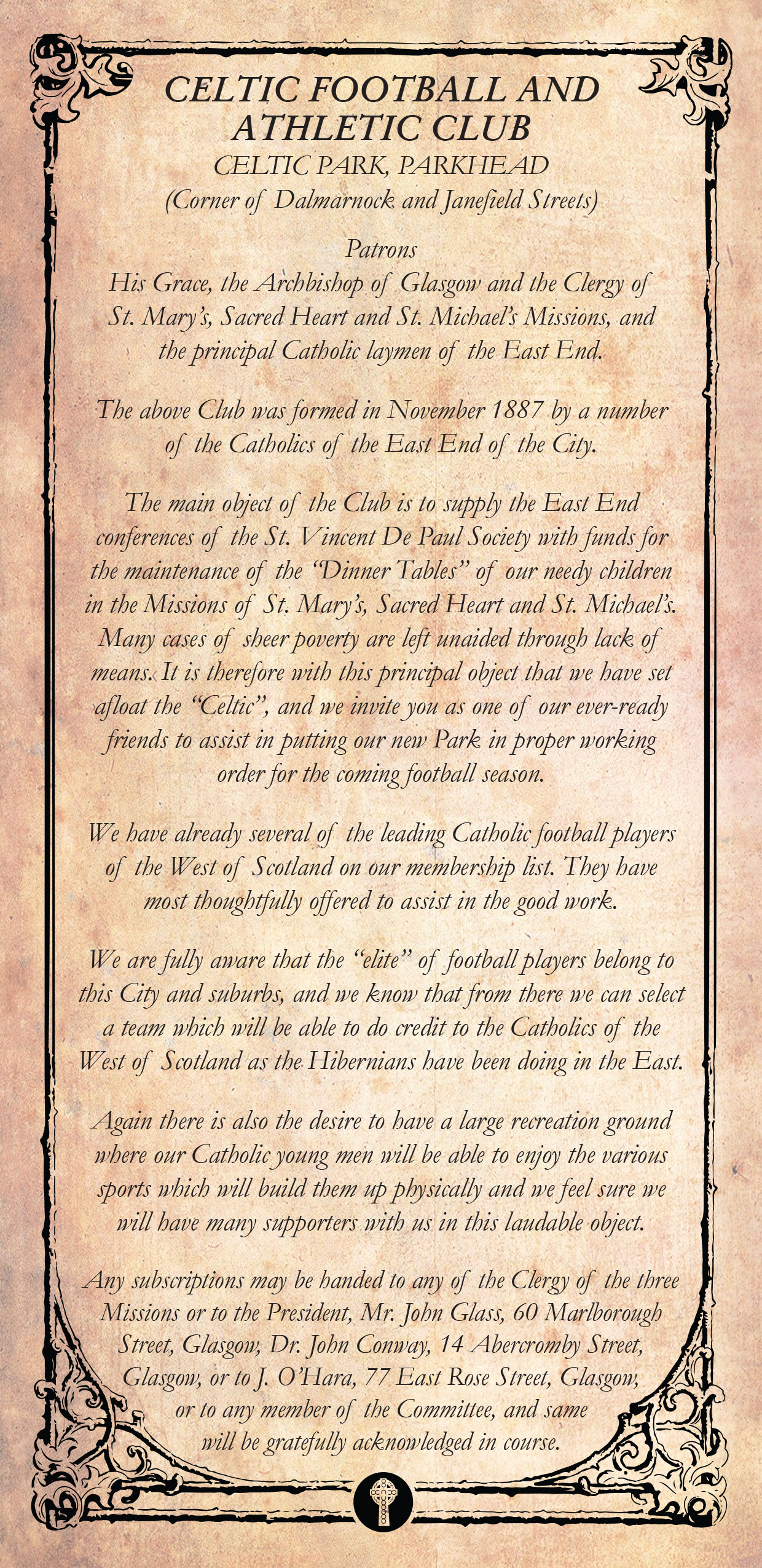 In discussions which took place over the summer of 1887 Walfrid and Dorotheus pursued the idea of a Glasgow Irish team being established in the East End to provide permanent financial support to the Dinner Tables. Key political and religious contacts in Glasgow were approached to support the idea but it was St. Mary’s Parish in the Calton, where John Glass, Dr. John Conway, Pat Welsh and John McLaughlin among others were based, that drove the Marist’s idea forward. A football club was formally created at a meeting at St. Mary’s Hall on 6th November 1887. In the Circular issued to the local parishes some weeks later, it stated that the “main objective” of the new club was to supply funds for the maintenance of the Dinner Tables in the three East End parishes of St Mary’s, Sacred Heart and St. Michael’s: Many cases of sheer poverty are left unaided through lack of means. It is therefore with this principal object that we have set afloat the “Celtic”.