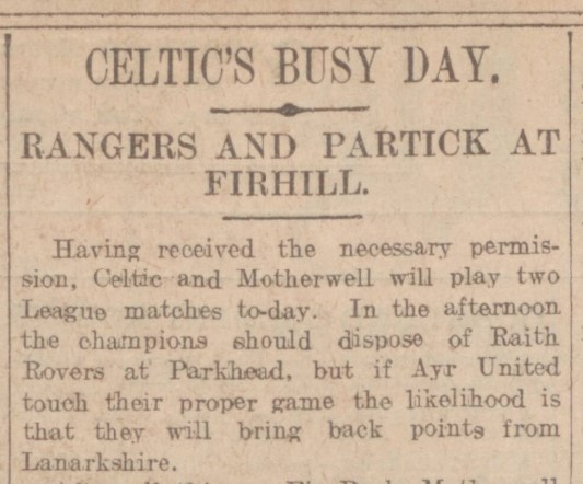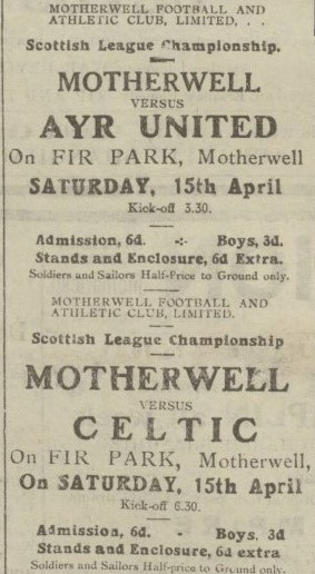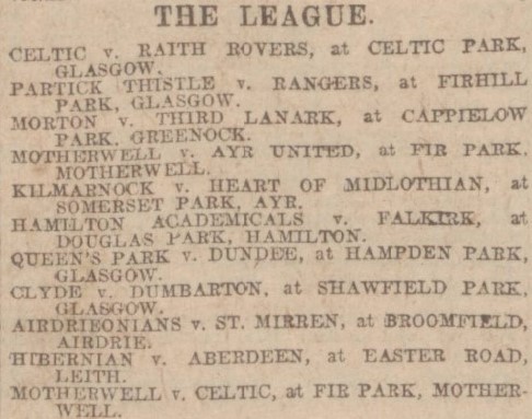Anyone looking at the Scottish League fixtures published for Saturday 15th April 1916 would have been forgiven for thinking a typo had been made. Instead of ten fixtures there were eleven – and it looked as though Celtic and Motherwell were listed to play twice.