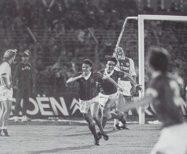 Celtic held on to their precious advantage until half-time. As soon as the second-half was underway they were subject to relentless Ajax attacks. It was a similar scenario to eleven years earlier in the same stadium when Jock Stein’s team met Cruyff (that time man-marked by Davie Hay) and Co. at the European Cup quarter-final stage and held the Dutch until half-time – before conceding three second half goals and going out of the tournament to the eventual champions. On this occasion Pat Bonner was Celtic’s last line of defence and he made two excellent saves early in the second half – first turning a Cruyff free-kick around the post and then pulling off an amazing jump to push a Kieft header over the crossbar. Celtic were restricted to occasional breakaways and the threat to Bonner’s goal remained – on the hour mark an audacious bicycle kick from Schoenaker just missed its target.