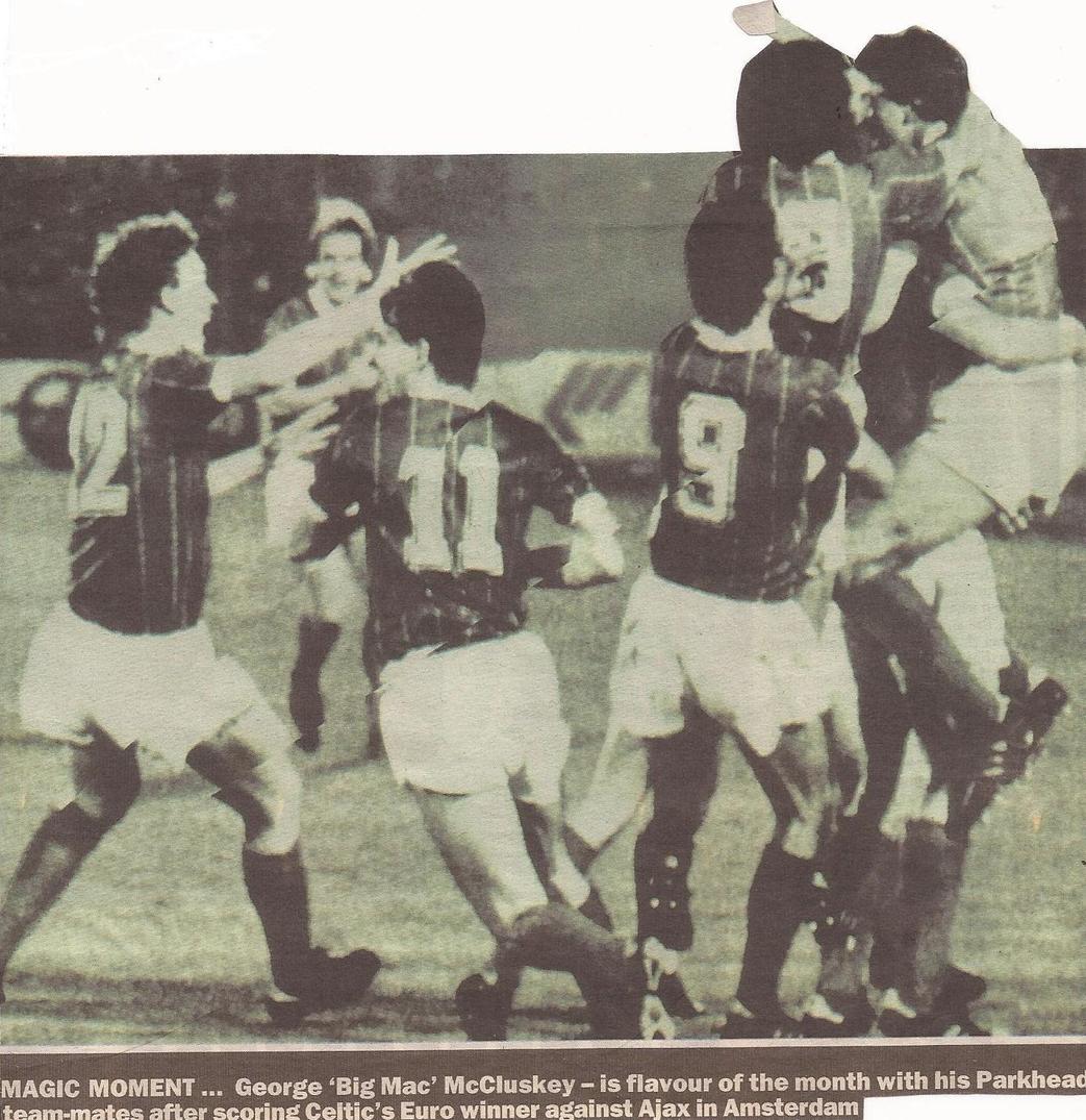 In the 82nd minute a ball was headed clear by the Ajax defence out to Celtic’s right midfield where Graeme Sinclair picked it up and went on a foraging run down Celtic’s right. With no little class he side-stepped one and then another opponent before floating in a perfect cross to the heart of the Ajax penalty box – where Frank McGarvey had ghosted in between the two central defenders. He met the ball with his head as he was falling back. It looped up and over Schrijver’s head . . . on to the top of the crossbar and behind. McGarvey picked himself up, uttered an oath as he walked away and received a commiserating pat on the shoulder from the referee. The Italian ref – and everyone in the stadium but especially McGarvey – knew that was Celtic’s big chance. And it was gone.