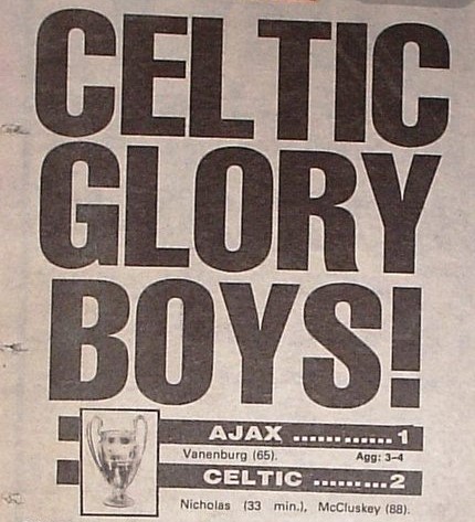 That short report does a slight dis-service to both Celtic strikers. The return pass from McGarvey into the path of Nicholas was an excellent back-heel which Nicholas then used to completely deceive two defenders, dropping them both on their arses, before he curled the ball with his left foot – from just inside the box – above Schrijvers and into the top left-hand corner. Four Celtic players involved, four Ajax players left dumb-founded by the movement of Nicholas. His finish was absolutely exquisite. It was, and remains, one of the greatest ever Celtic goals scored on foreign shores.
